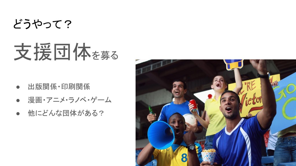 どうやって? 支援団体を募る • 出版関係・印刷関係 • 漫画・アニメ・ラノベ・ゲーム • 他にどんな団体がある?