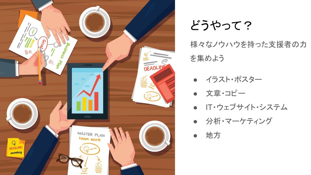 どうやって? 様々なノウハウを持った支援者の力 を集めよう • イラスト・ポスター • 文章・コピー • IT・ウェブサイト・システム •