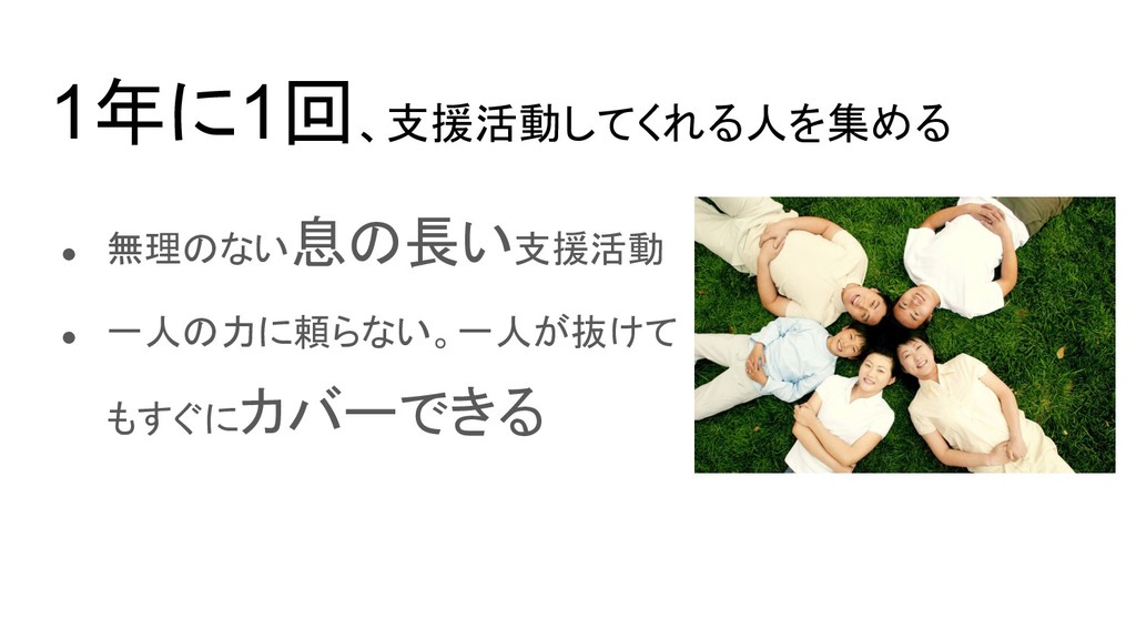 1年に1回、支援活動してくれる人を集める • 無理のない息の長い支援活動 • 一人の力に頼らない。一人が抜けて もすぐにカバーできる