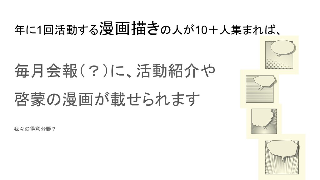 年に1回活動する漫画描きの人が10+人集まれば、 毎月会報(?)に、活動紹介や 啓蒙の漫画が載せられます 我々の得意分野?