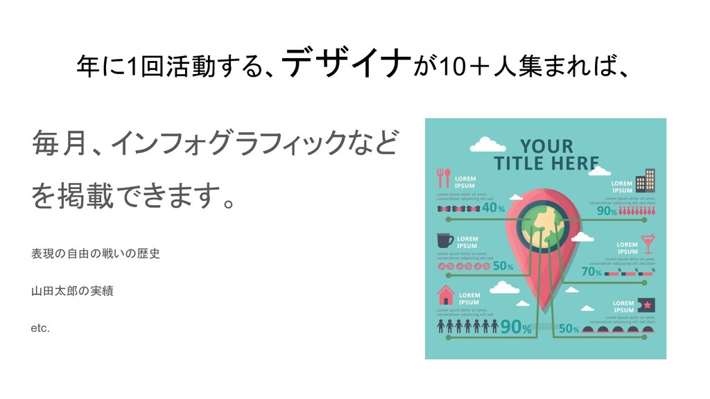 年に1回活動する、デザイナが10+人集まれば、 毎月、インフォグラフィックなど を掲載できます。 表現の自由の戦いの歴史 山田太郎の実績 etc.