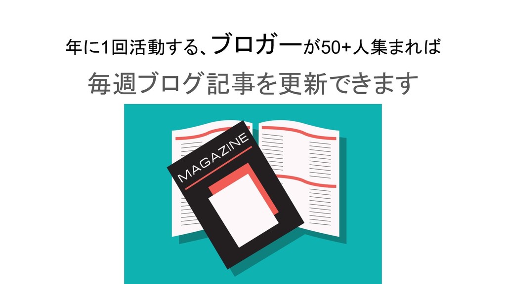 年に1回活動する、ブロガーが50+人集まれば 毎週ブログ記事を更新できます