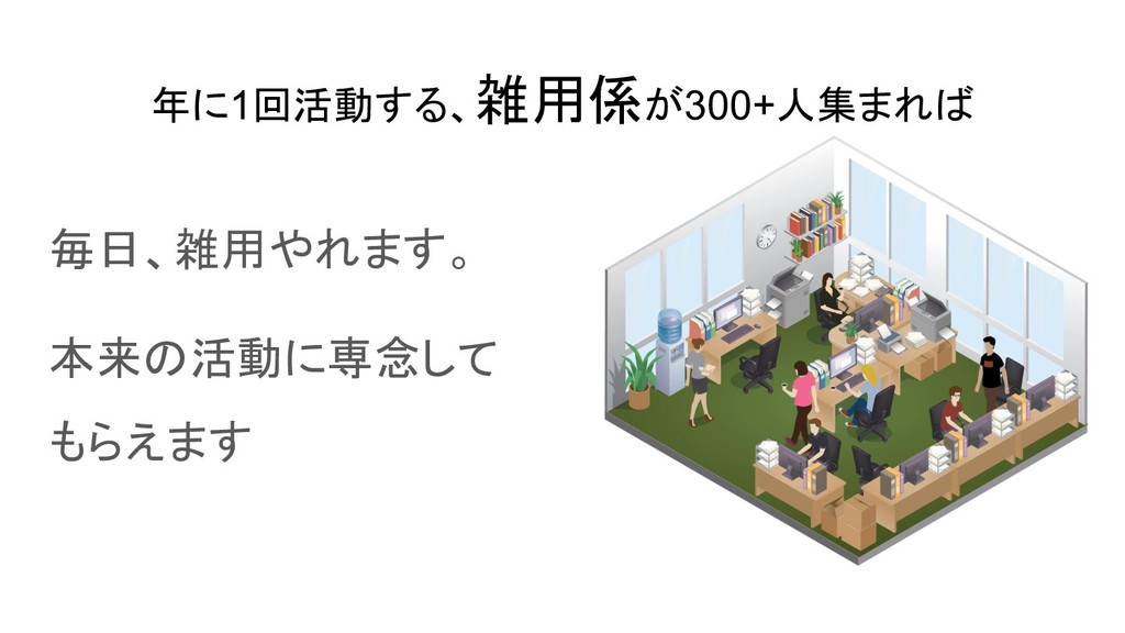 年に1回活動する、雑用係が300+人集まれば 毎日、雑用やれます。 本来の活動に専念して もらえます