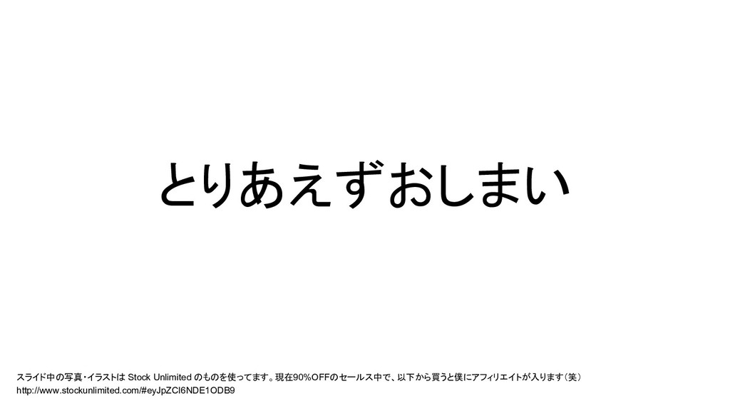 とりあえずおしまい スライド中の写真・イラストは Stock Unlimited のものを使ってます。現在90%OFFのセールス中で、以下から買うと僕にアフィリエイトが入ります(笑) http://www.stockunlimited.com/#eyJpZCI6NDE1ODB9