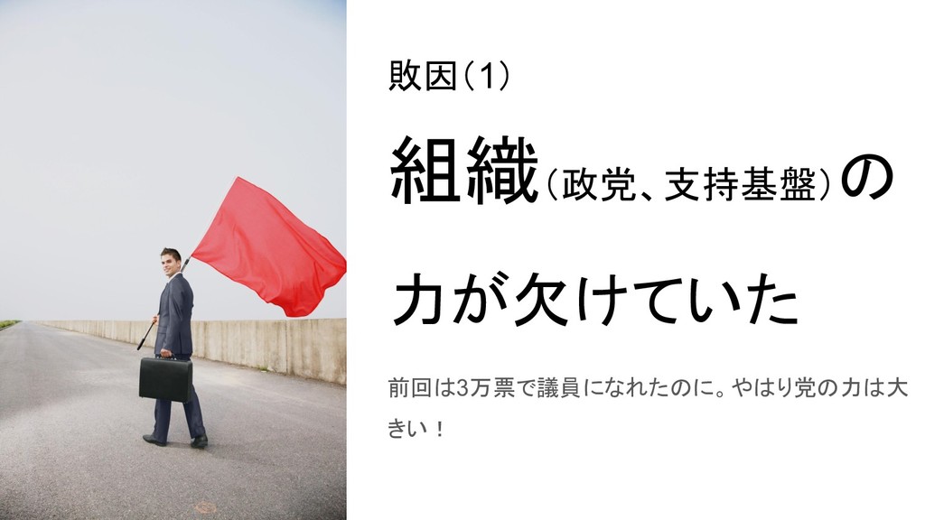 敗因(1) 組織(政党、支持基盤)の 力が欠けていた 前回は3万票で議員になれたのに。やはり党の力は大 きい!