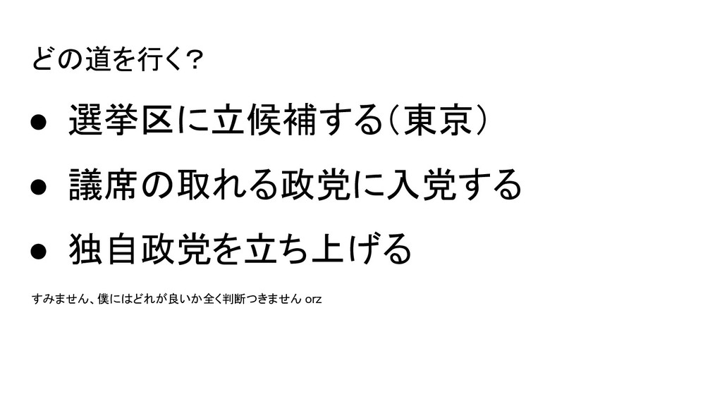 どの道を行く? • 選挙区に立候補する(東京) • 議席の取れる政党に入党する • 独自政党を立ち上げる すみません、僕にはどれが良いか全く判断つきません orz