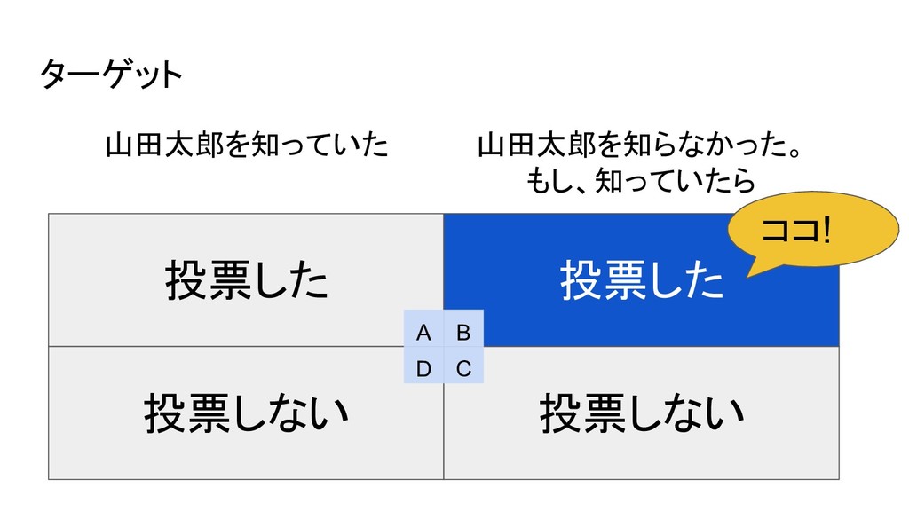 ターゲット 投票した 投票しない 投票した 投票しない 山田太郎を知っていた 山田太郎を知らなかった。 もし、知っていたら A B