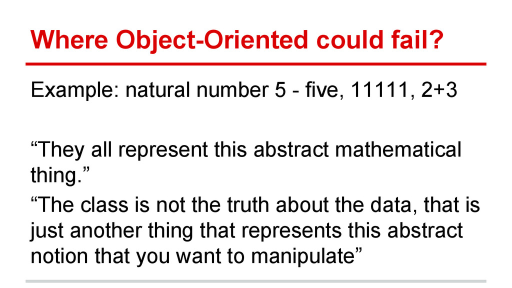 11111, 2+3 “They all represent this abstract mathematical thing.” “The class is not the truth about the data, that is just another thing that represents this abstract notion that you want to manipulate”