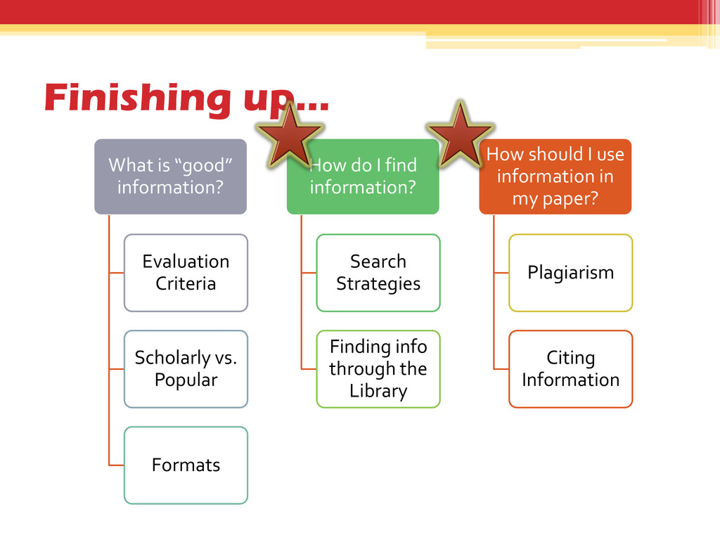 Popular Formats How do I find information? Search Strategies Finding info through the Library How should I use information in my paper? Plagiarism Citing Information