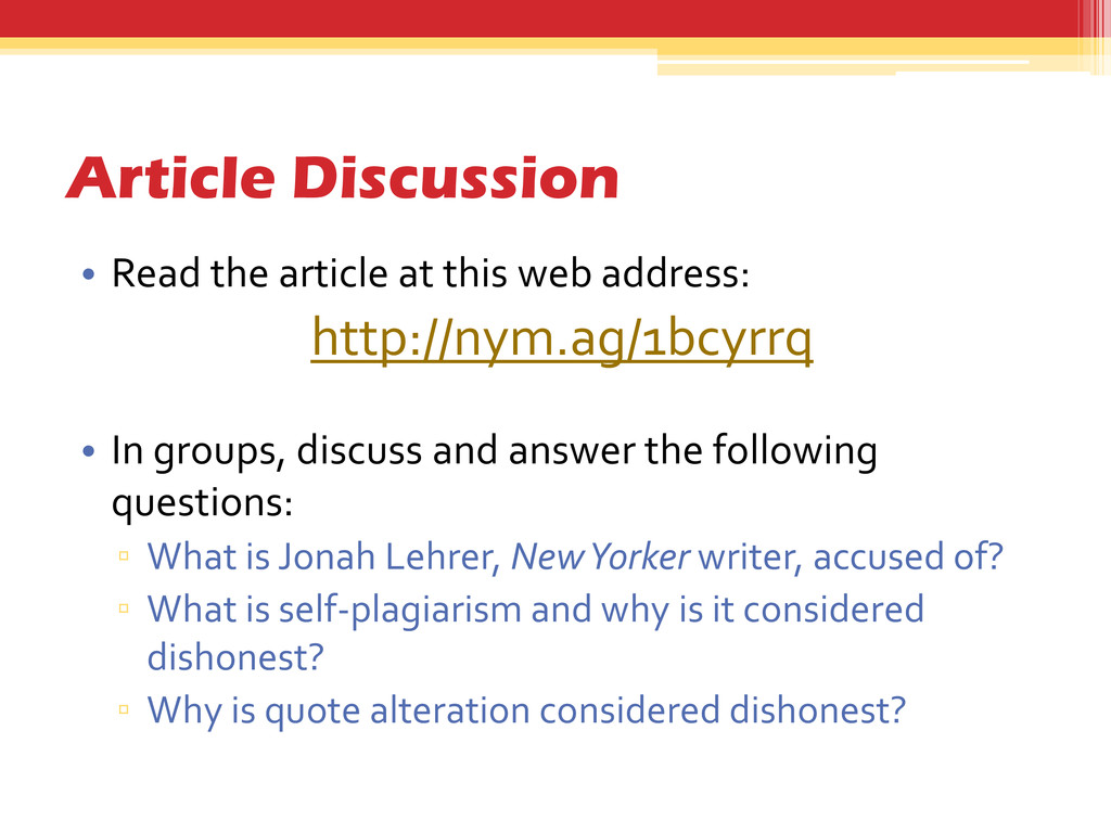 http://nym.ag/1bcyrrq • In groups, discuss and answer the following questions: ▫ What is Jonah Lehrer, New Yorker writer, accused of? ▫ What is self-plagiarism and why is it considered dishonest? ▫ Why is quote alteration considered dishonest?