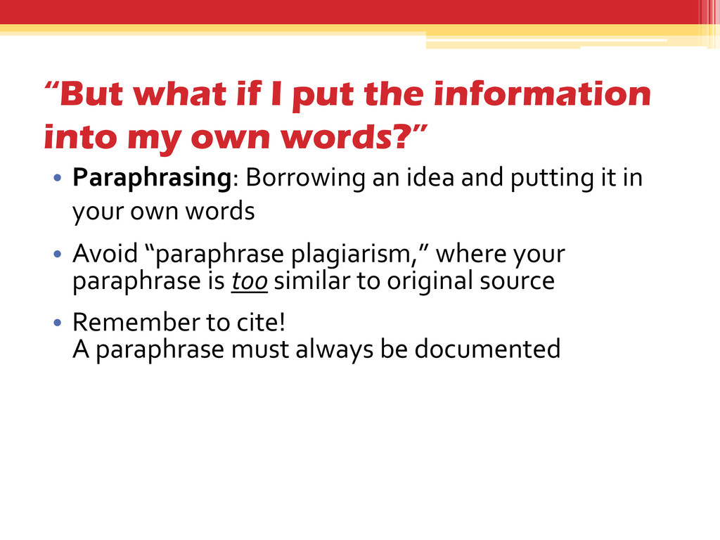 words?” • Paraphrasing: Borrowing an idea and putting it in your own words • Avoid “paraphrase plagiarism,” where your paraphrase is too similar to original source • Remember to cite! A paraphrase must always be documented