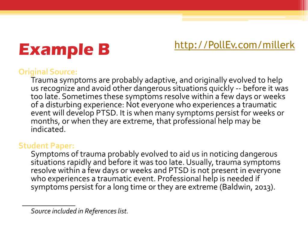 originally evolved to help us recognize and avoid other dangerous situations quickly -- before it was too late. Sometimes these symptoms resolve within a few days or weeks of a disturbing experience: Not everyone who experiences a traumatic event will develop PTSD. It is when many symptoms persist for weeks or months, or when they are extreme, that professional help may be indicated. Student Paper: Symptoms of trauma probably evolved to aid us in noticing dangerous situations rapidly and before it was too late. Usually, trauma symptoms resolve within a few days or weeks and PTSD is not present in everyone who experiences a traumatic event. Professional help is needed if symptoms persist for a long time or they are extreme (Baldwin, 2013). _______________ Source included in References list. http://PollEv.com/millerk