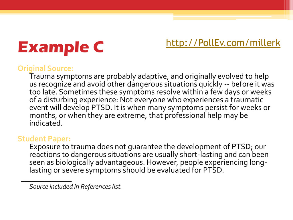 originally evolved to help us recognize and avoid other dangerous situations quickly -- before it was too late. Sometimes these symptoms resolve within a few days or weeks of a disturbing experience: Not everyone who experiences a traumatic event will develop PTSD. It is when many symptoms persist for weeks or months, or when they are extreme, that professional help may be indicated. Student Paper: Exposure to trauma does not guarantee the development of PTSD; our reactions to dangerous situations are usually short-lasting and can been seen as biologically advantageous. However, people experiencing long- lasting or severe symptoms should be evaluated for PTSD. _______________ Source included in References list. http://PollEv.com/millerk