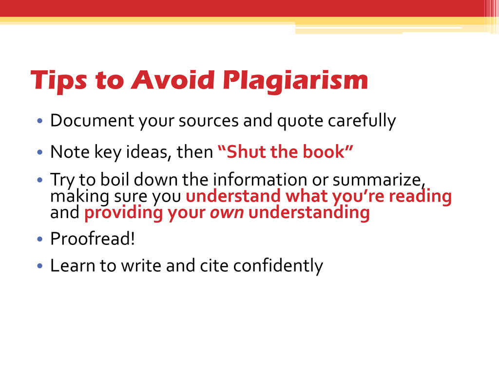 carefully • Note key ideas, then “Shut the book” • Try to boil down the information or summarize, making sure you understand what you’re reading and providing your own understanding • Proofread! • Learn to write and cite confidently