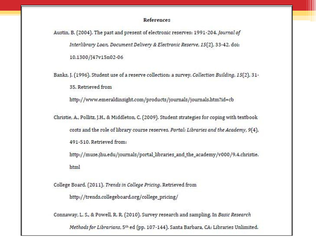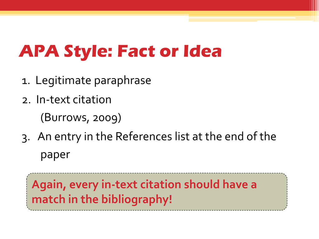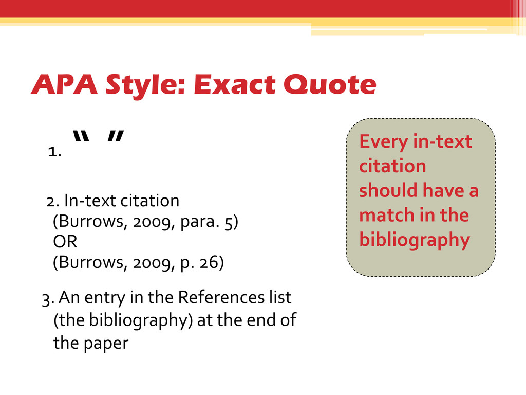 (Burrows, 2009, para. 5) OR (Burrows, 2009, p. 26) 3. An entry in the References list (the bibliography) at the end of the paper Every in-text citation should have a match in the bibliography