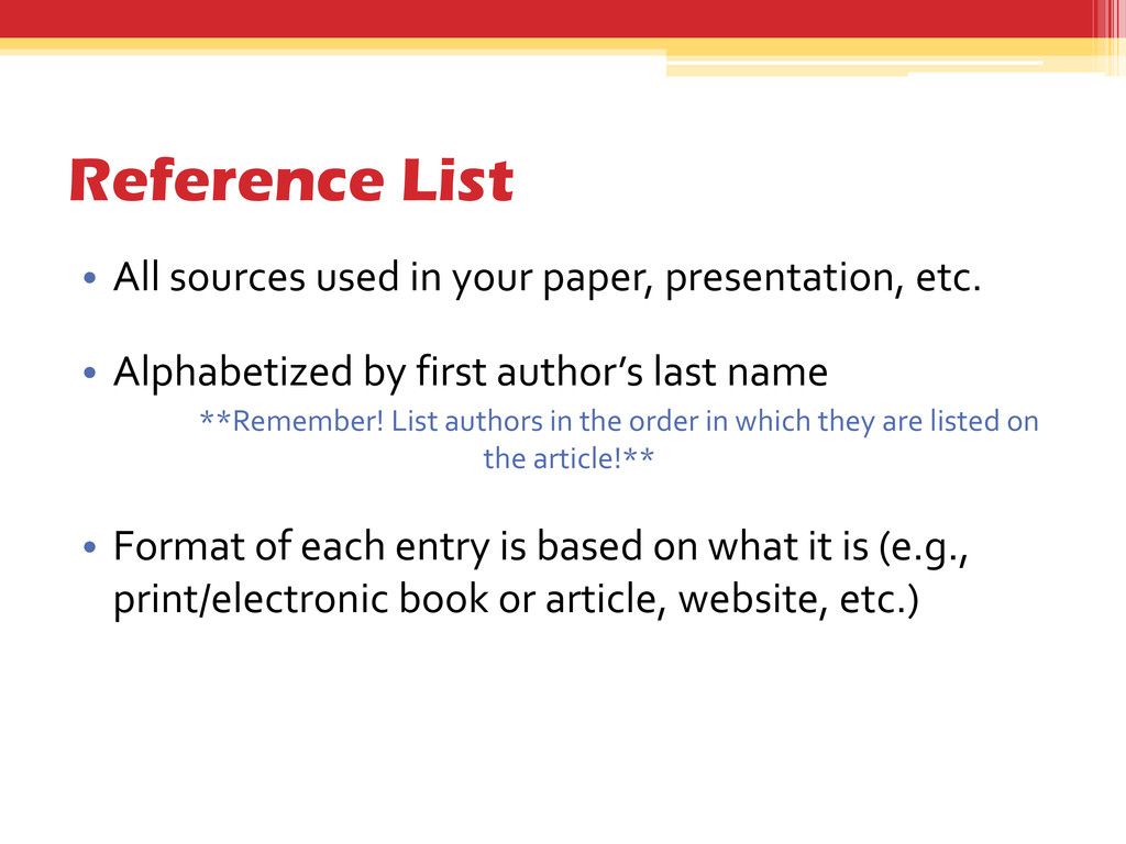 etc. • Alphabetized by first author’s last name **Remember! List authors in the order in which they are listed on the article!** • Format of each entry is based on what it is (e.g., print/electronic book or article, website, etc.)