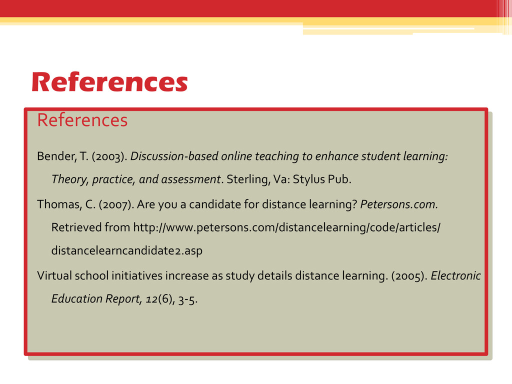 student learning: Theory, practice, and assessment. Sterling, Va: Stylus Pub. Thomas, C. (2007). Are you a candidate for distance learning? Petersons.com. Retrieved from http://www.petersons.com/distancelearning/code/articles/ distancelearncandidate2.asp Virtual school initiatives increase as study details distance learning. (2005). Electronic Education Report, 12(6), 3-5.
