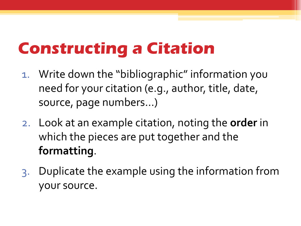 need for your citation (e.g., author, title, date, source, page numbers…) 2. Look at an example citation, noting the order in which the pieces are put together and the formatting. 3. Duplicate the example using the information from your source.