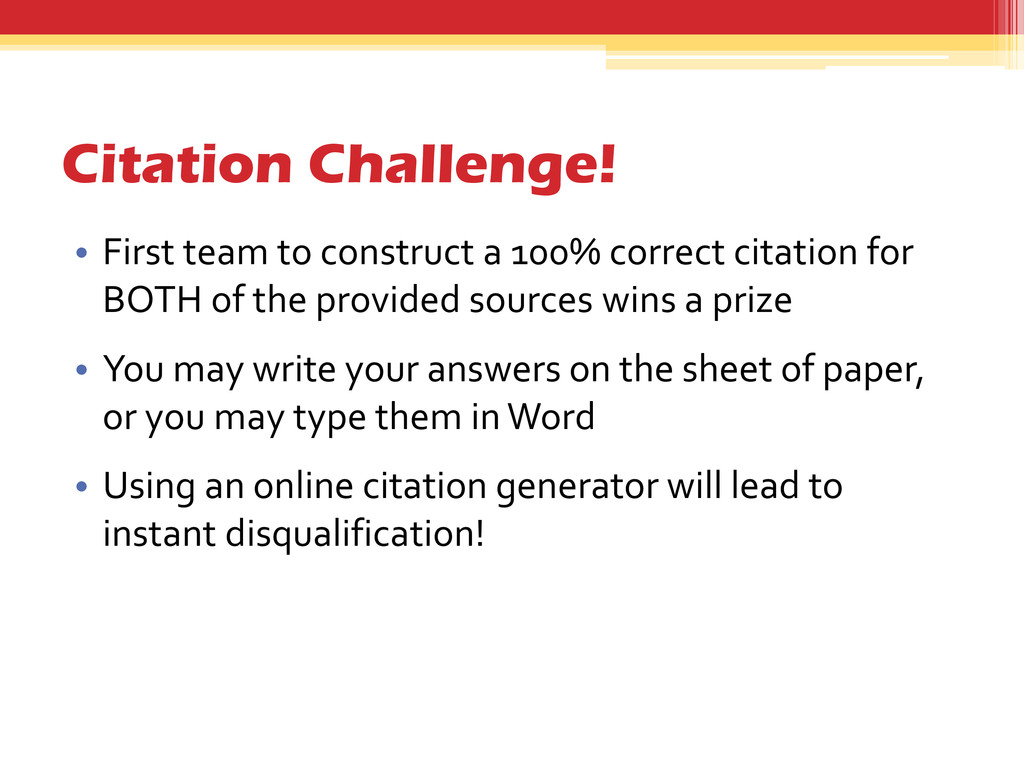 citation for BOTH of the provided sources wins a prize • You may write your answers on the sheet of paper, or you may type them in Word • Using an online citation generator will lead to instant disqualification!