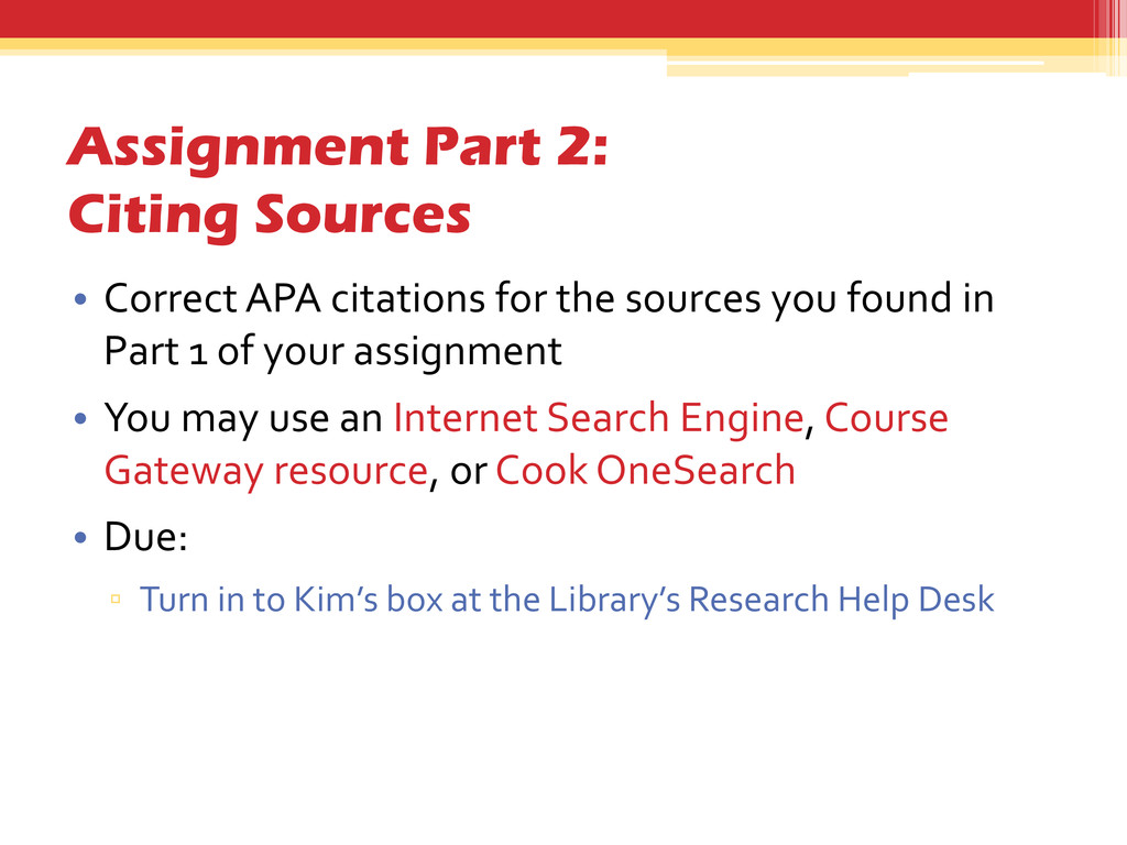 the sources you found in Part 1 of your assignment • You may use an Internet Search Engine, Course Gateway resource, or Cook OneSearch • Due: ▫ Turn in to Kim’s box at the Library’s Research Help Desk