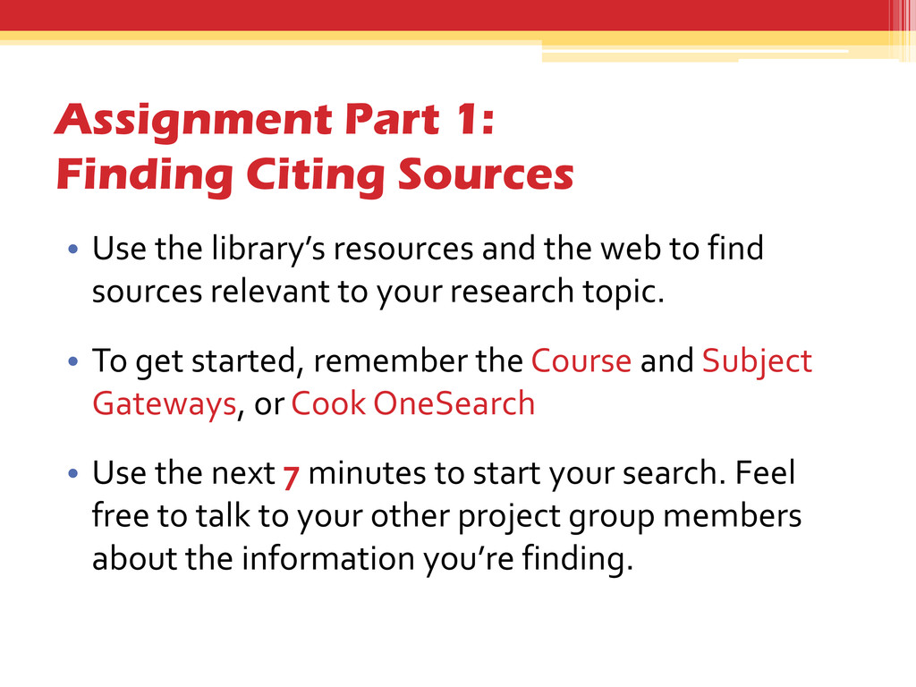 resources and the web to find sources relevant to your research topic. • To get started, remember the Course and Subject Gateways, or Cook OneSearch • Use the next 7 minutes to start your search. Feel free to talk to your other project group members about the information you’re finding.