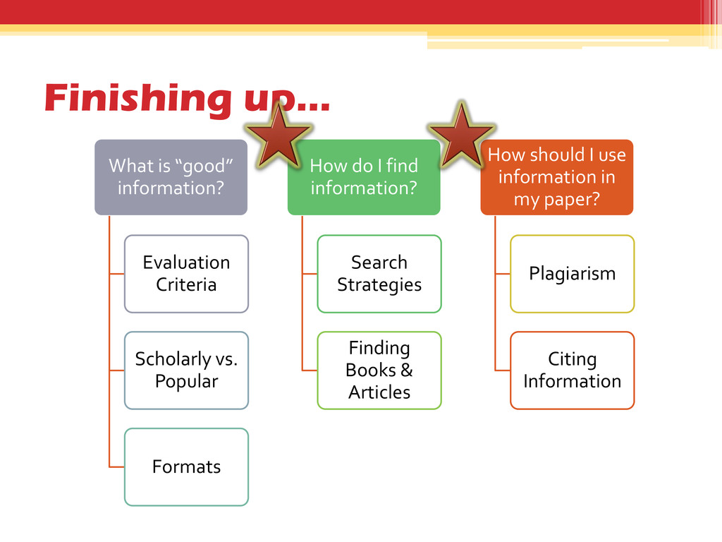 Popular Formats How do I find information? Search Strategies Finding Books & Articles How should I use information in my paper? Plagiarism Citing Information