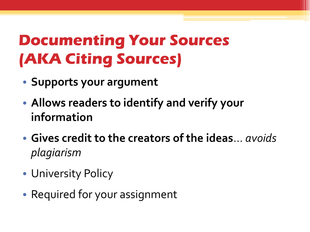 • Allows readers to identify and verify your information • Gives credit to the creators of the ideas… avoids plagiarism • University Policy • Required for your assignment