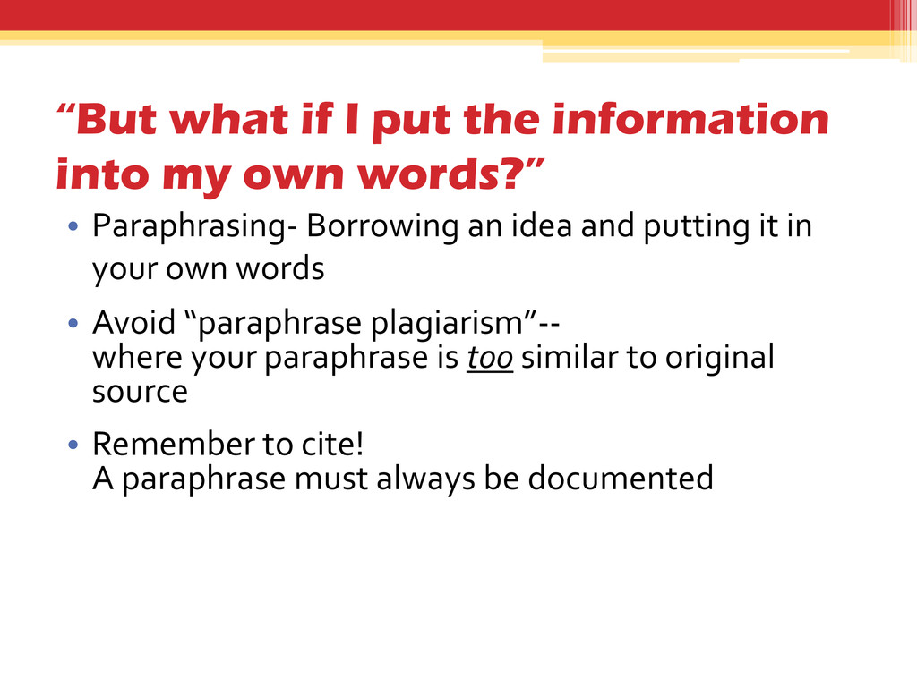 words?” • Paraphrasing- Borrowing an idea and putting it in your own words • Avoid “paraphrase plagiarism”-- where your paraphrase is too similar to original source • Remember to cite! A paraphrase must always be documented