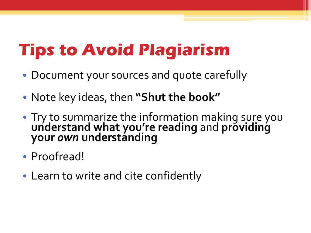carefully • Note key ideas, then “Shut the book” • Try to summarize the information making sure you understand what you’re reading and providing your own understanding • Proofread! • Learn to write and cite confidently