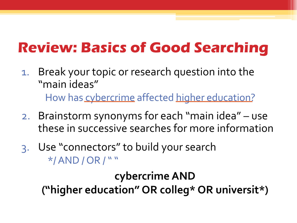 research question into the “main ideas” How has cybercrime affected higher education? 2. Brainstorm synonyms for each “main idea” – use these in successive searches for more information 3. Use “connectors” to build your search */ AND / OR / “ “ cybercrime AND (“higher education” OR colleg* OR universit*)