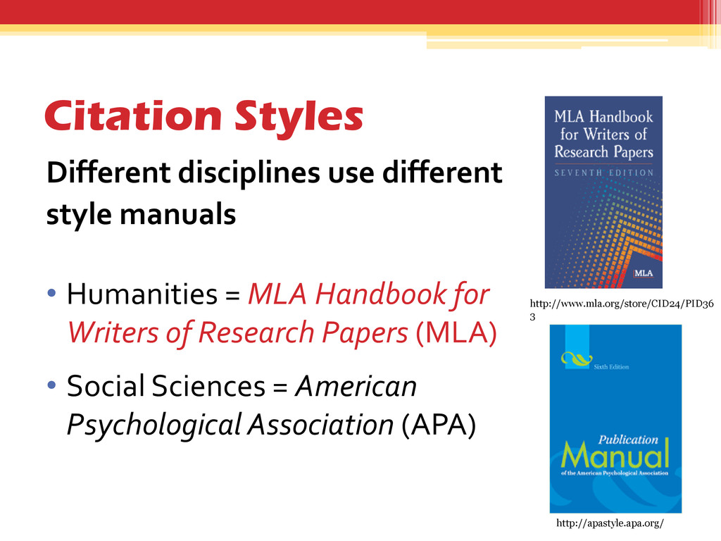 = MLA Handbook for Writers of Research Papers (MLA) • Social Sciences = American Psychological Association (APA) http://apastyle.apa.org/ http://www.mla.org/store/CID24/PID36 3
