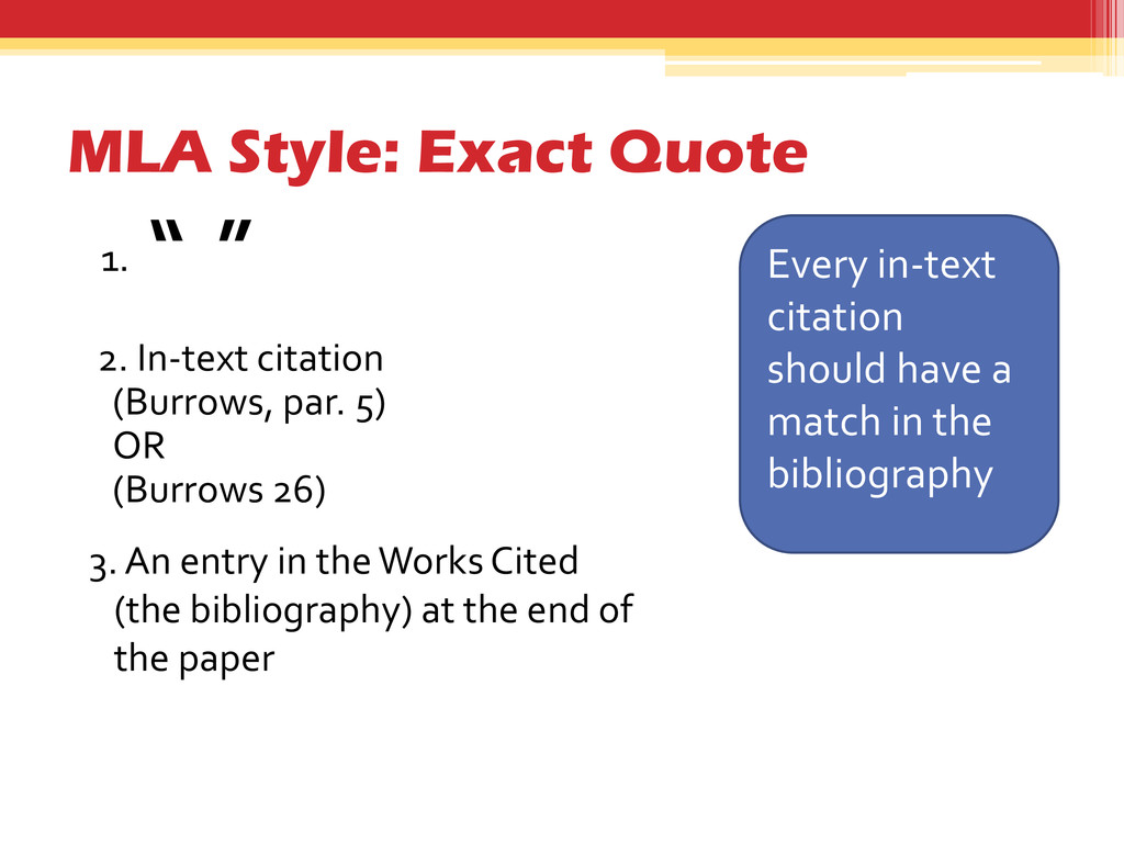 match in the bibliography 1. “ ” 2. In-text citation (Burrows, par. 5) OR (Burrows 26) 3. An entry in the Works Cited (the bibliography) at the end of the paper