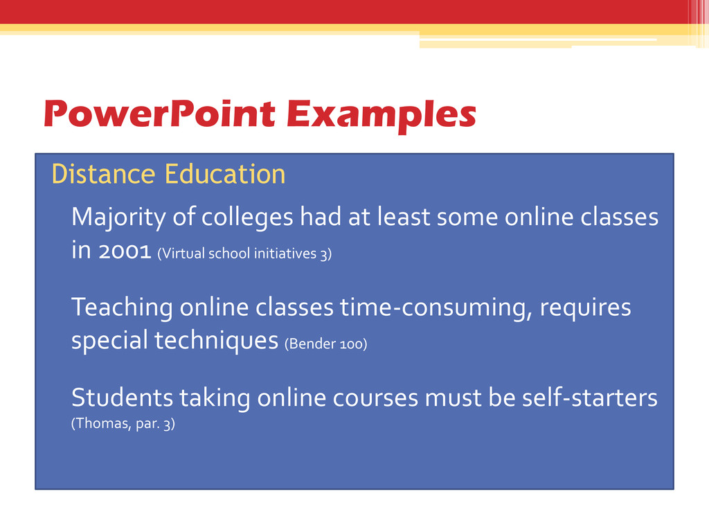 least some online classes in 2001 (Virtual school initiatives 3) • Teaching online classes time-consuming, requires special techniques (Bender 100) • Students taking online courses must be self-starters (Thomas, par. 3)