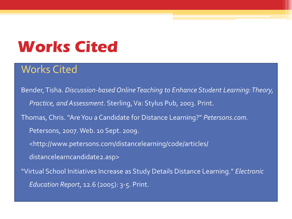 15. Works Cited Works Cited Bender, Tisha. Discussion-based Online Teaching to