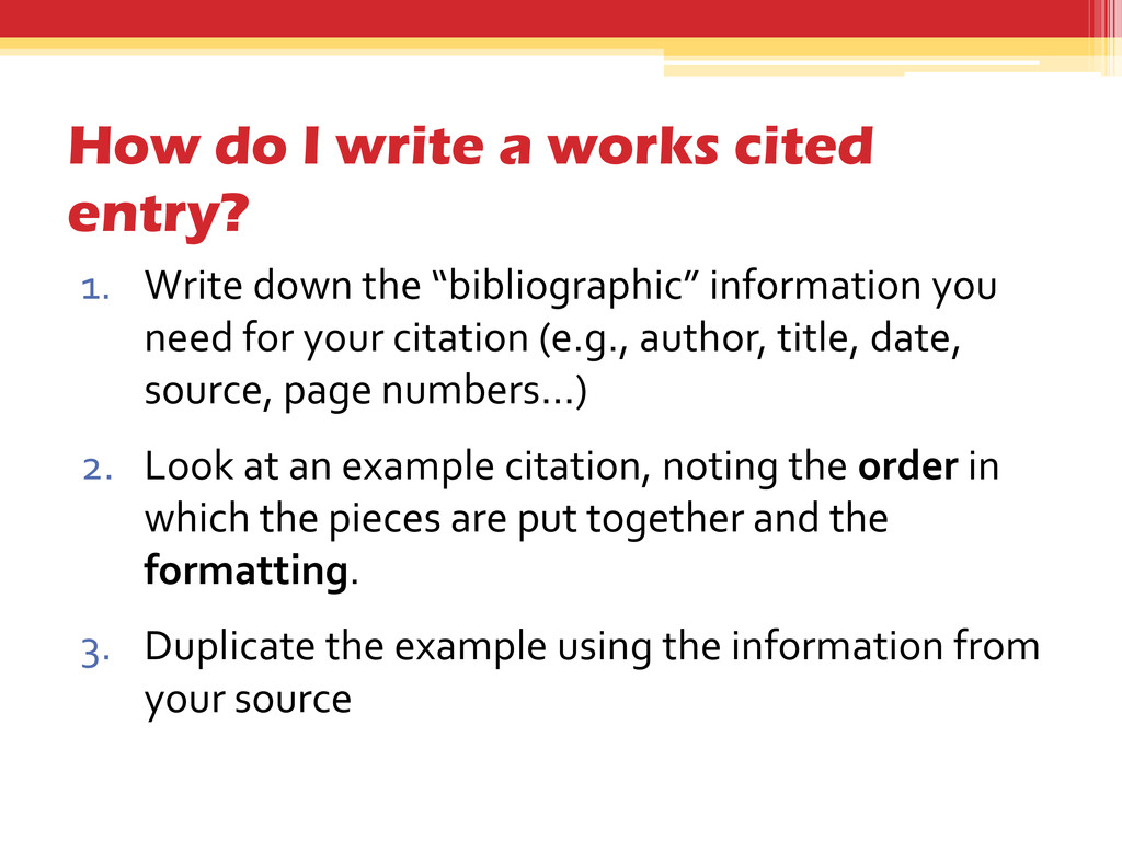 down the “bibliographic” information you need for your citation (e.g., author, title, date, source, page numbers…) 2. Look at an example citation, noting the order in which the pieces are put together and the formatting. 3. Duplicate the example using the information from your source
