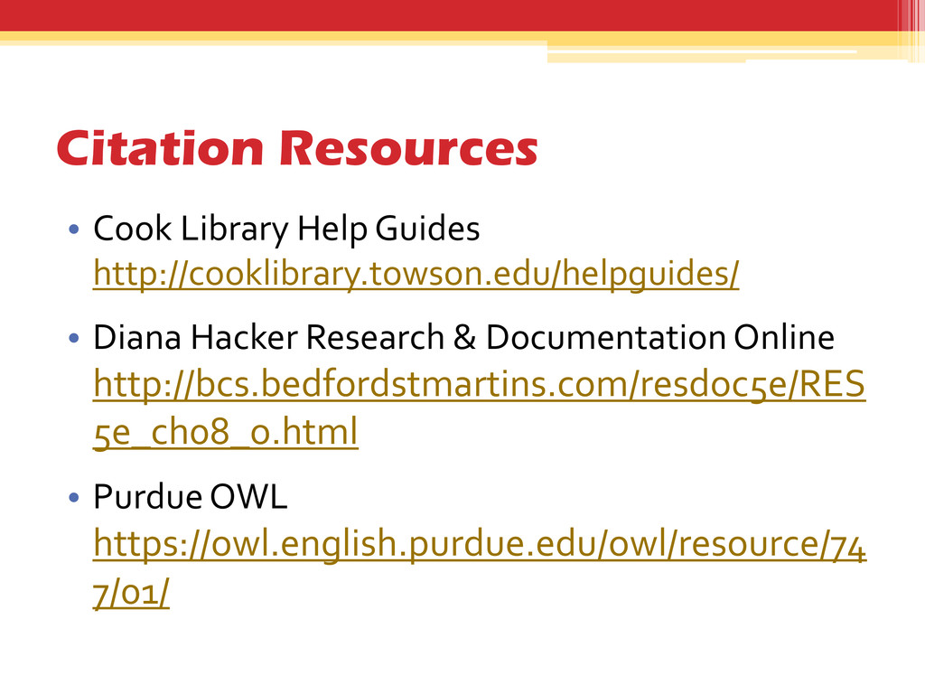 Hacker Research & Documentation Online http://bcs.bedfordstmartins.com/resdoc5e/RES 5e_ch08_o.html • Purdue OWL https://owl.english.purdue.edu/owl/resource/74 7/01/