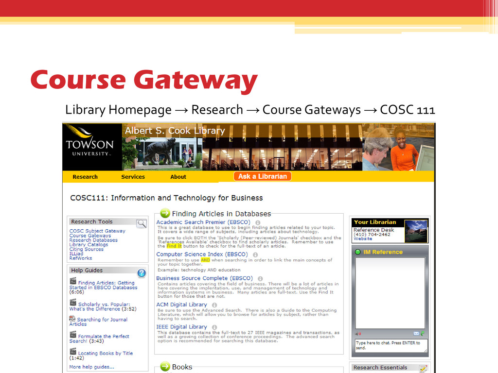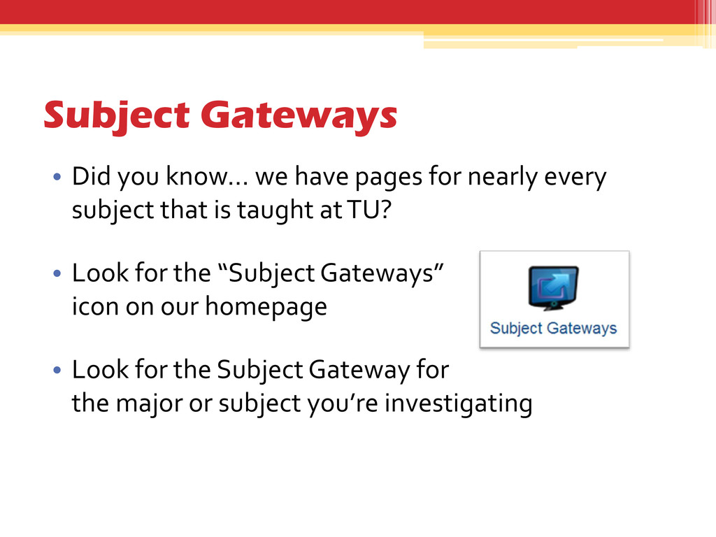 nearly every subject that is taught at TU? • Look for the “Subject Gateways” icon on our homepage • Look for the Subject Gateway for the major or subject you’re investigating