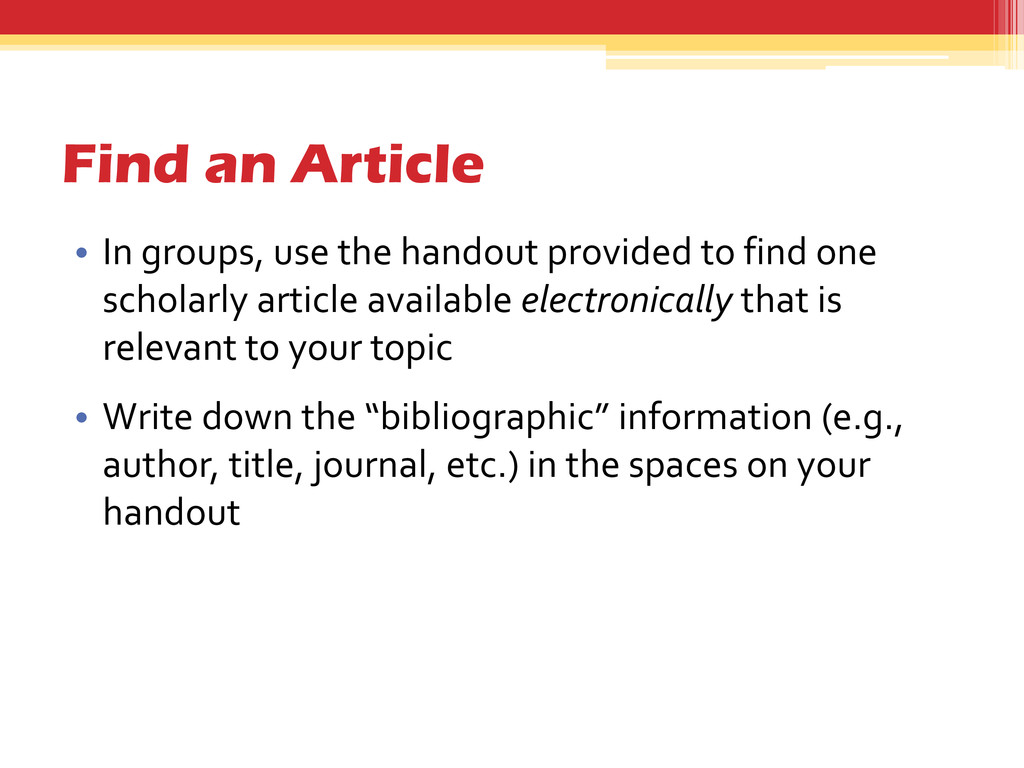 to find one scholarly article available electronically that is relevant to your topic • Write down the “bibliographic” information (e.g., author, title, journal, etc.) in the spaces on your handout