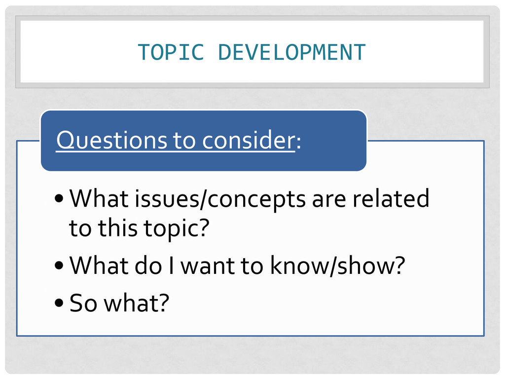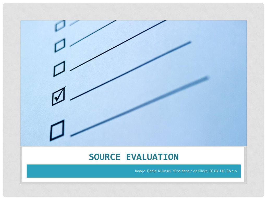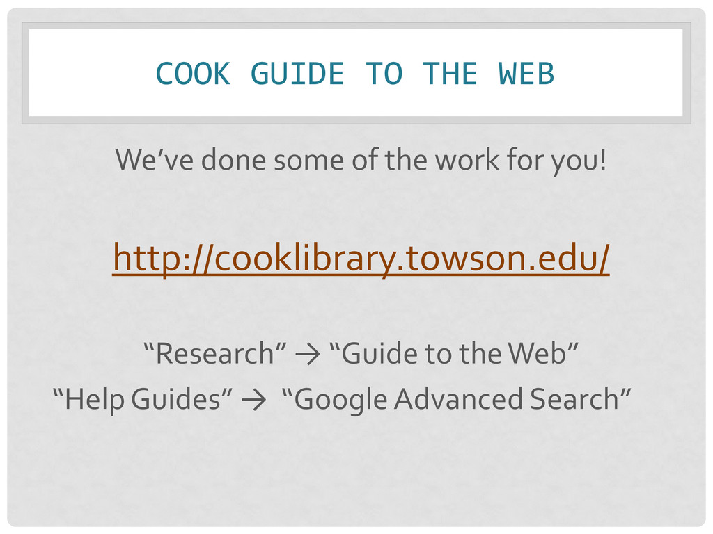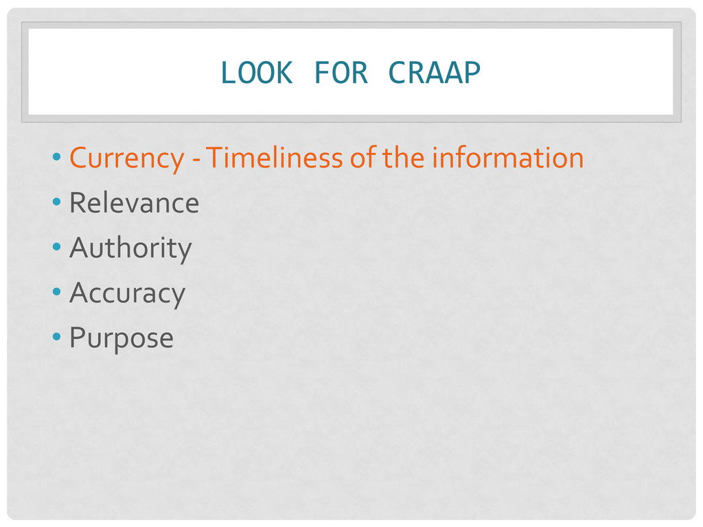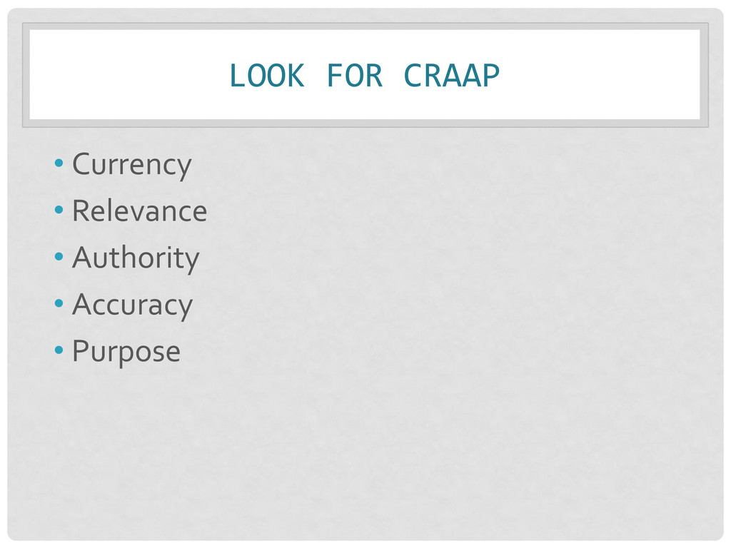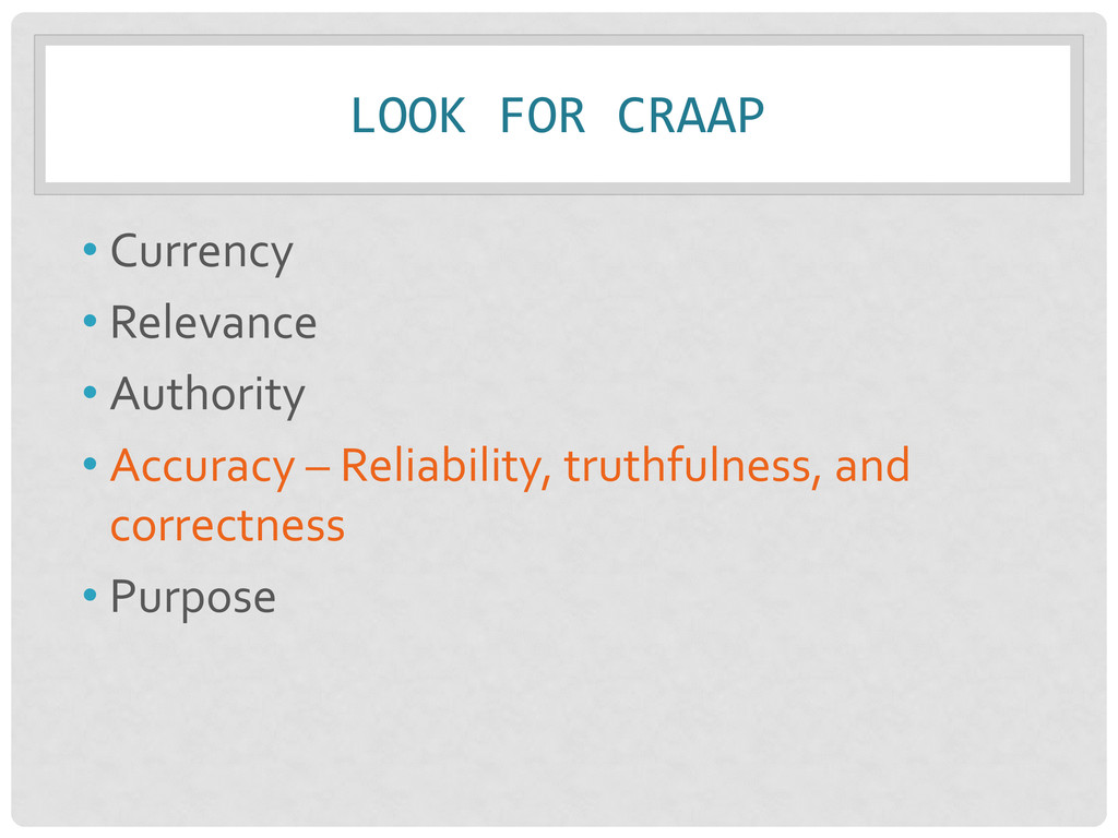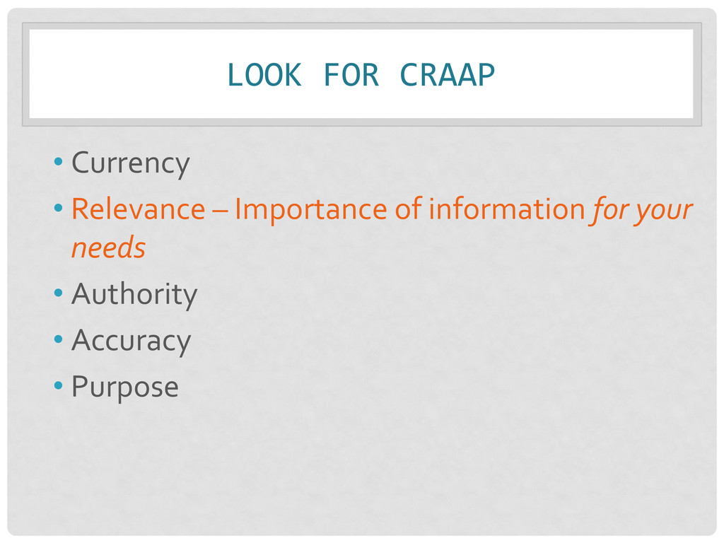 • Relevance – Importance of info. for your needs • Authority – Source & expertise • Accuracy – Reliability, truthfulness, and correctness • Purpose – Reason the information exists Remember: Not just one criteria, but a balance of all!