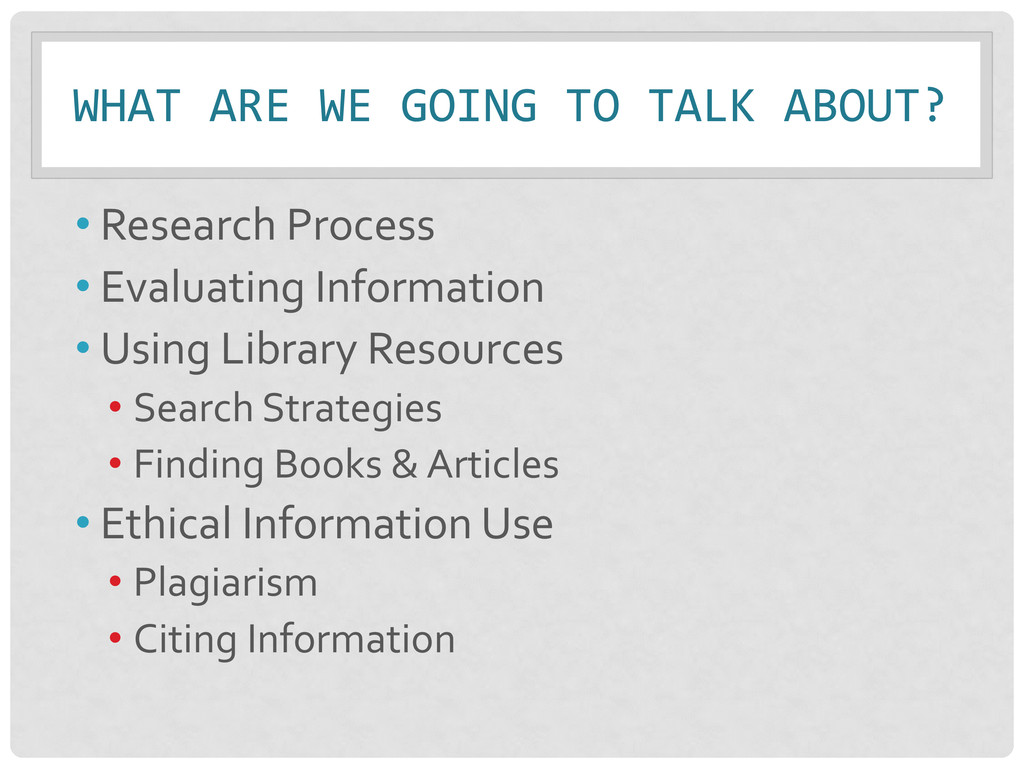 • Evaluating Information • Using Library Resources • Search Strategies • Finding Books & Articles • Ethical Information Use • Plagiarism • Citing Information
