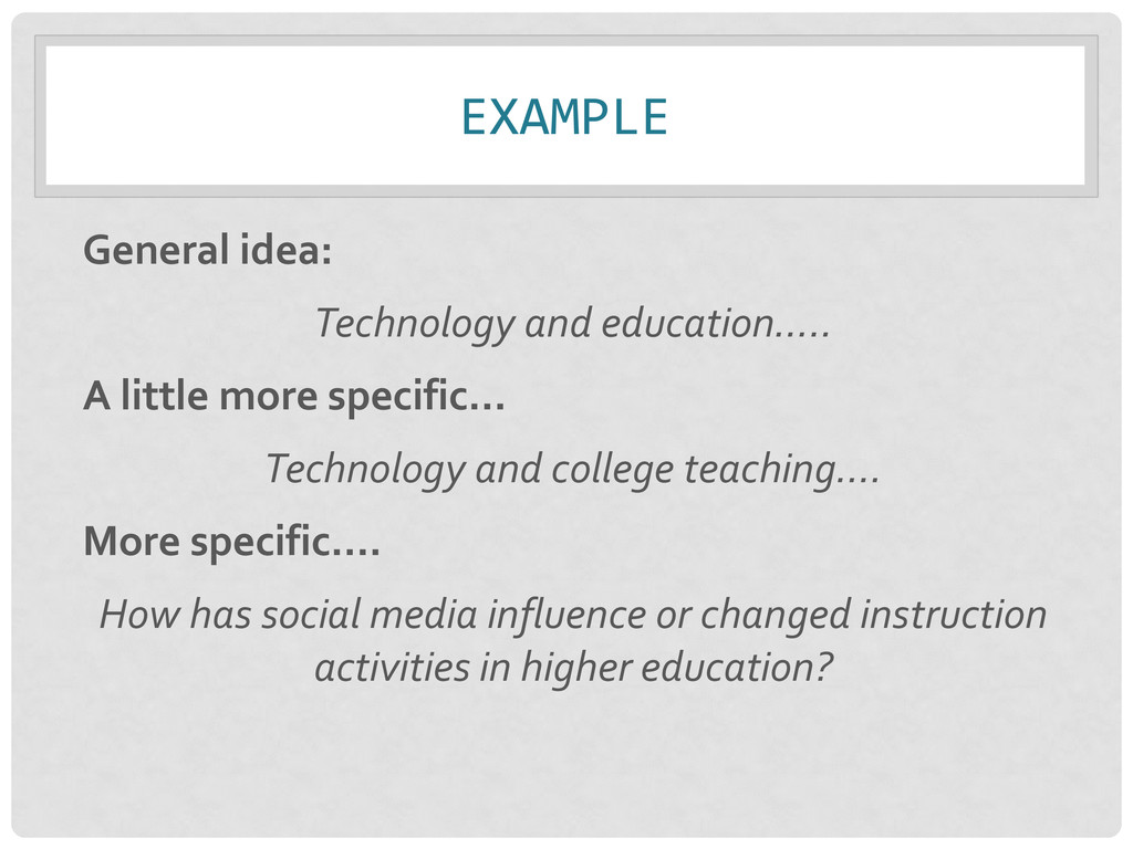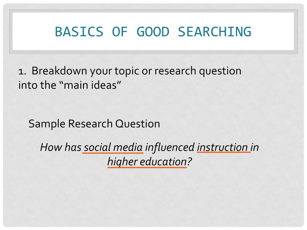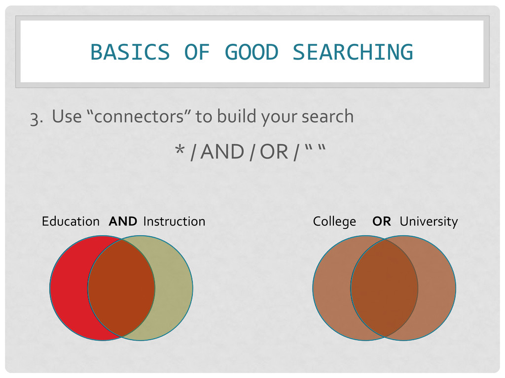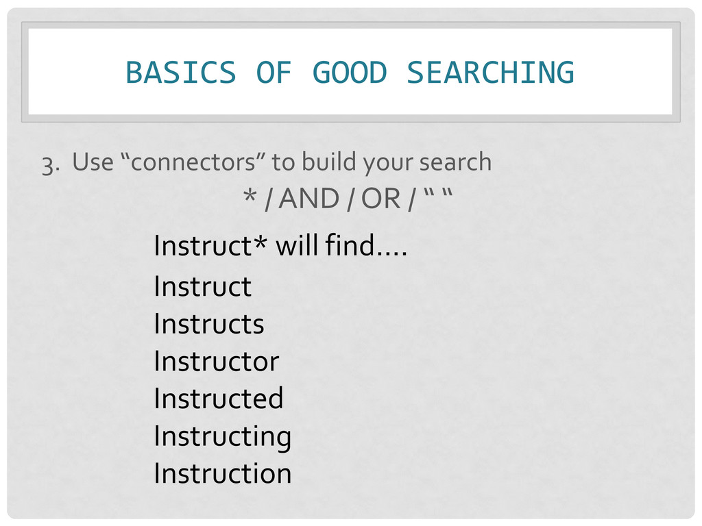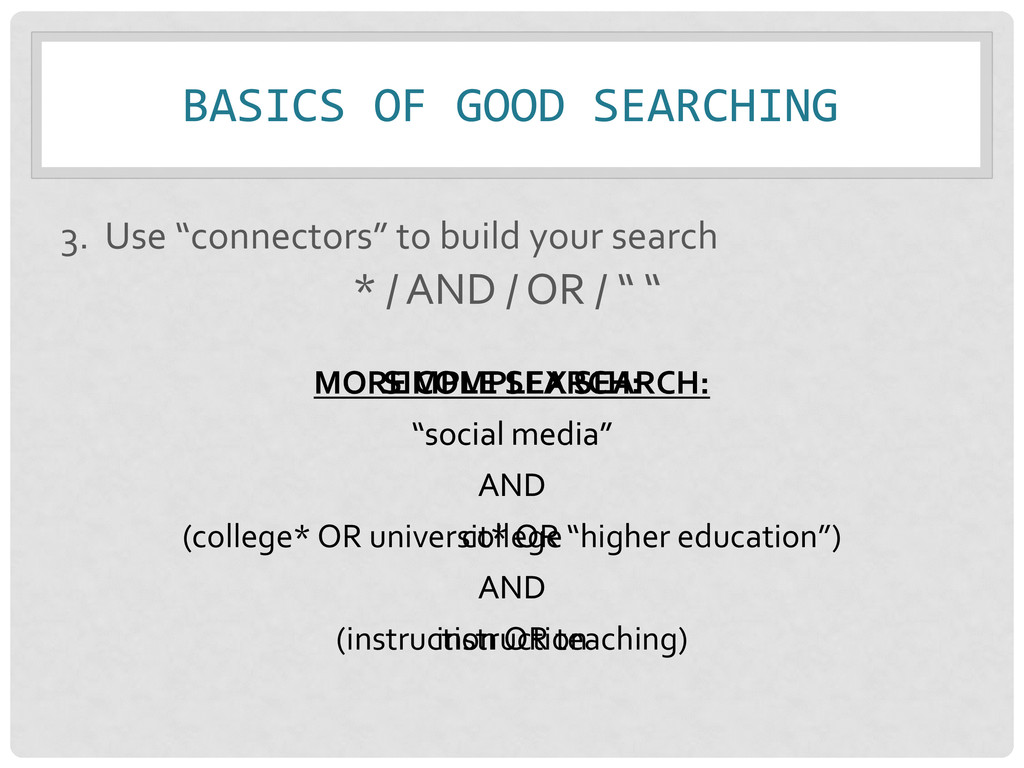 search * / AND / OR / “ “ MORE COMPLEX SEARCH: “social media” AND (college* OR universit* OR “higher education”) AND (instruction OR teaching) SIMPLE SEARCH: “social media” AND college AND instruction