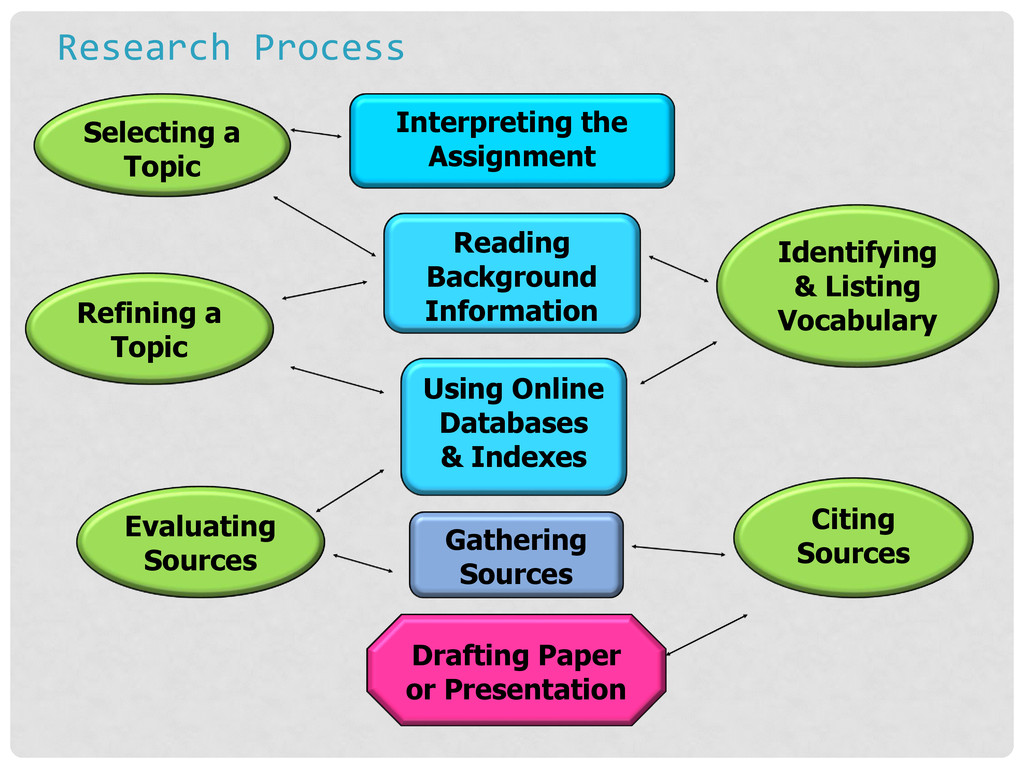 Indexes Gathering Sources Drafting Paper or Presentation Identifying & Listing Vocabulary Citing Sources Refining a Topic Evaluating Sources Selecting a Topic Research Process