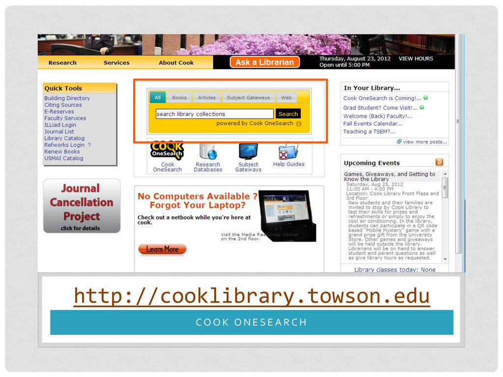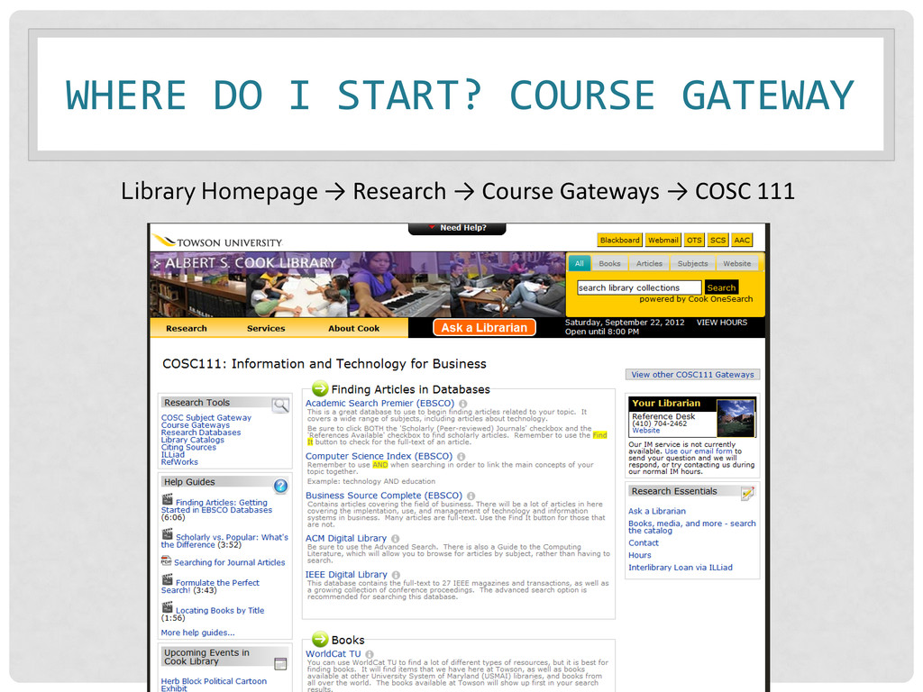 of the Library's resources at once. • Find books, articles, media, government information, and other library resources all in one place. • Search what Towson owns as well as resources at other USMAI Libraries. *but not ALL!!