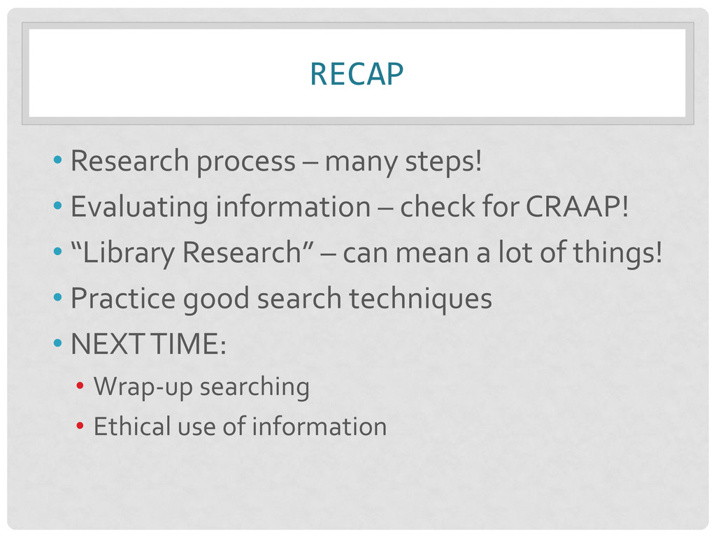– check for CRAAP! • “Library Research” – can mean a lot of things! • Practice good search techniques • NEXT TIME: • Wrap-up searching • Ethical use of information