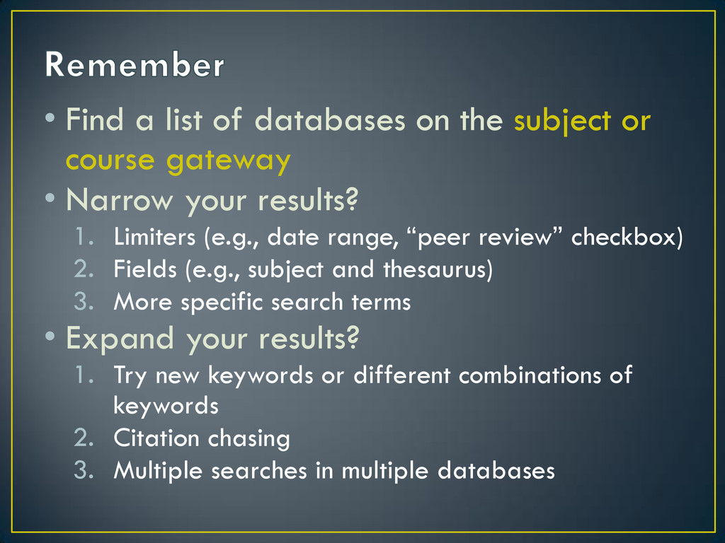 course gateway • Narrow your results? 1. Limiters (e.g., date range, “peer review” checkbox) 2. Fields (e.g., subject and thesaurus) 3. More specific search terms • Expand your results? 1. Try new keywords or different combinations of keywords 2. Citation chasing 3. Multiple searches in multiple databases