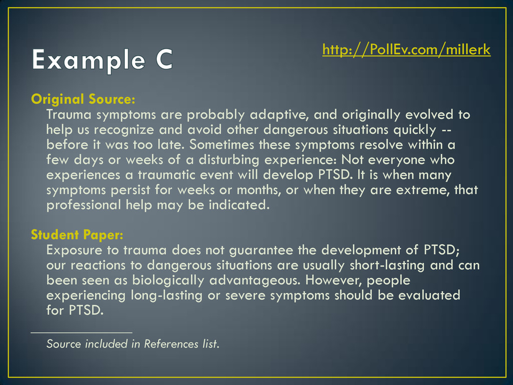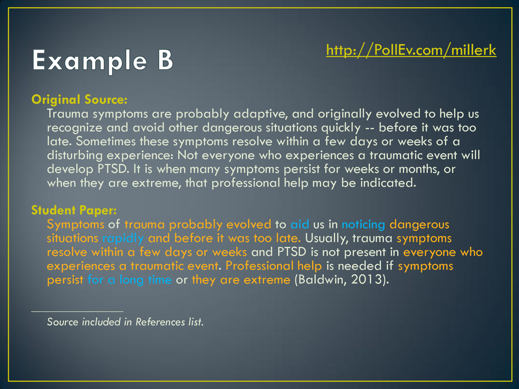 to help us recognize and avoid other dangerous situations quickly -- before it was too late. Sometimes these symptoms resolve within a few days or weeks of a disturbing experience: Not everyone who experiences a traumatic event will develop PTSD. It is when many symptoms persist for weeks or months, or when they are extreme, that professional help may be indicated. Student Paper: Symptoms of trauma probably evolved to aid us in noticing dangerous situations rapidly and before it was too late. Usually, trauma symptoms resolve within a few days or weeks and PTSD is not present in everyone who experiences a traumatic event. Professional help is needed if symptoms persist for a long time or they are extreme (Baldwin, 2013). _______________ Source included in References list. http://PollEv.com/millerk