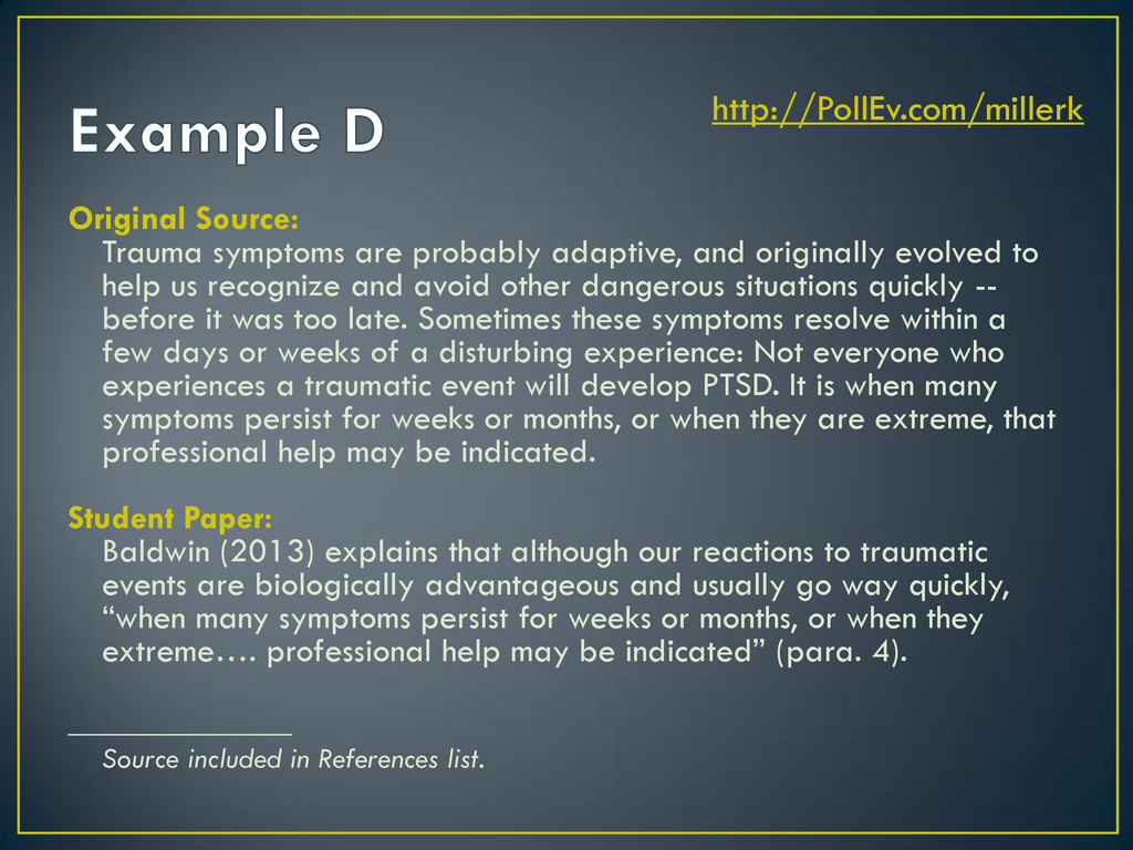 to help us recognize and avoid other dangerous situations quickly -- before it was too late. Sometimes these symptoms resolve within a few days or weeks of a disturbing experience: Not everyone who experiences a traumatic event will develop PTSD. It is when many symptoms persist for weeks or months, or when they are extreme, that professional help may be indicated. Student Paper: Baldwin (2013) explains that although our reactions to traumatic events are biologically advantageous and usually go way quickly, “when many symptoms persist for weeks or months, or when they extreme…. professional help may be indicated” (para. 4). _______________ Source included in References list. http://PollEv.com/millerk