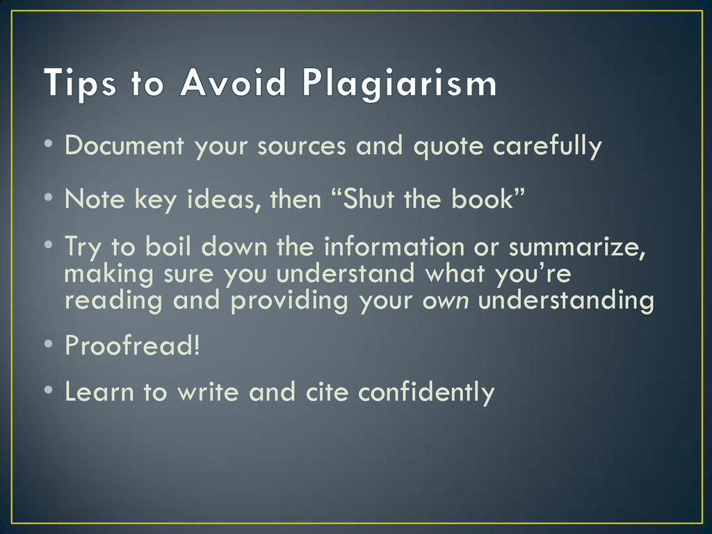 ideas, then “Shut the book” • Try to boil down the information or summarize, making sure you understand what you’re reading and providing your own understanding • Proofread! • Learn to write and cite confidently