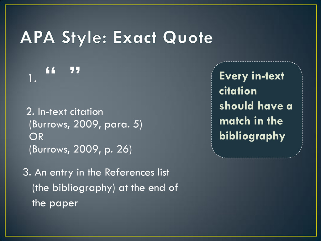 OR (Burrows, 2009, p. 26) 3. An entry in the References list (the bibliography) at the end of the paper Every in-text citation should have a match in the bibliography