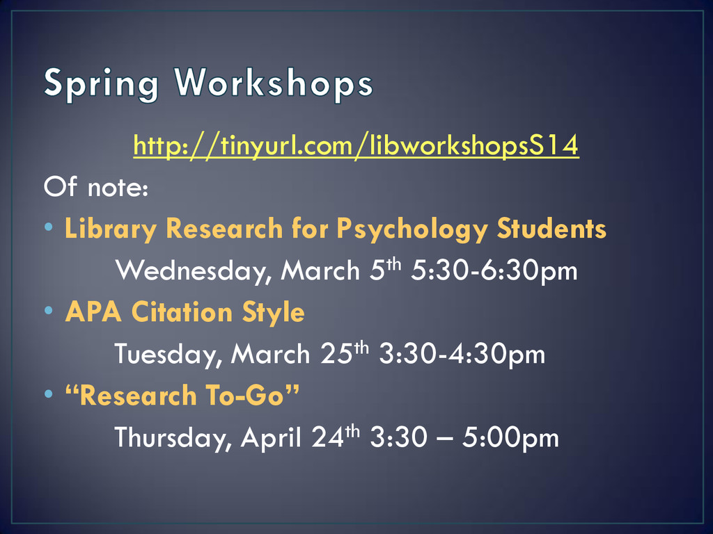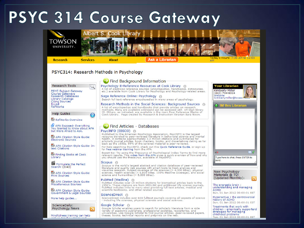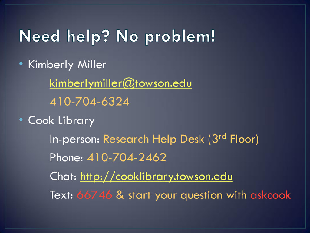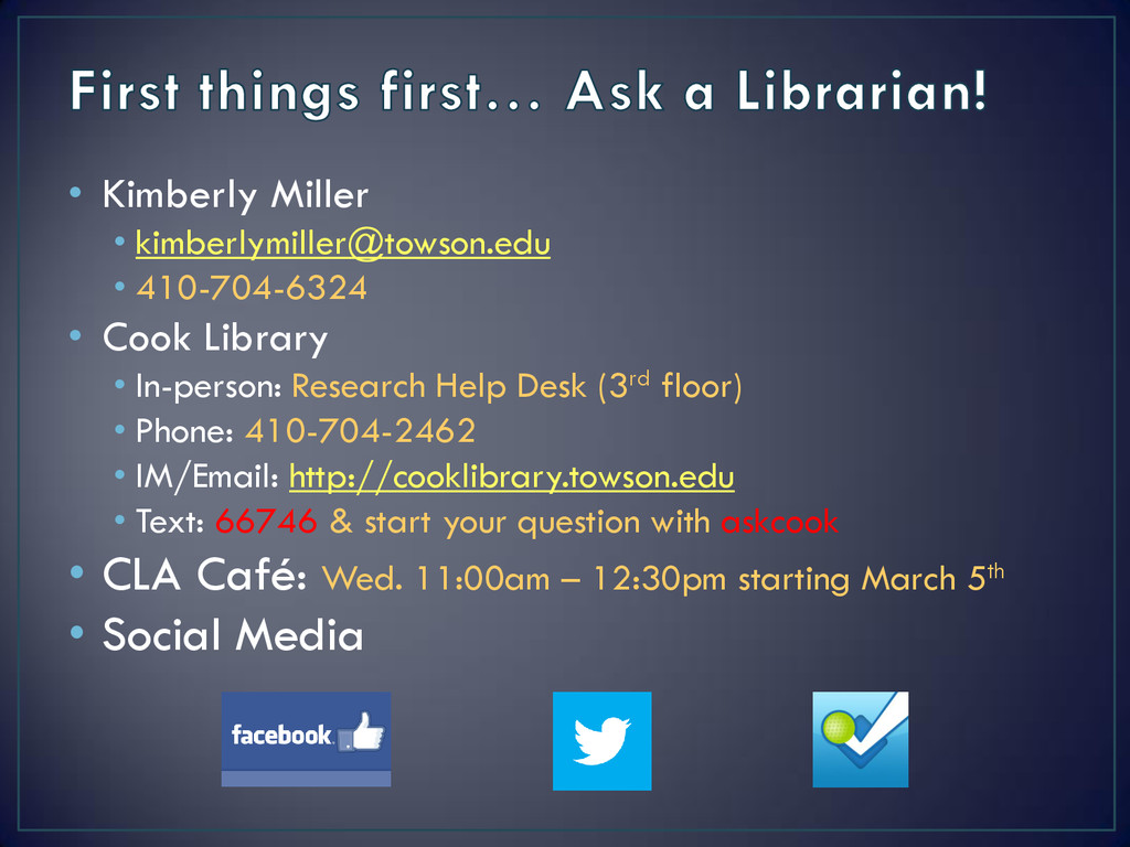 • In-person: Research Help Desk (3rd floor) • Phone: 410-704-2462 • IM/Email: http://cooklibrary.towson.edu • Text: 66746 & start your question with askcook • CLA Café: Wed. 11:00am – 12:30pm starting March 5th • Social Media